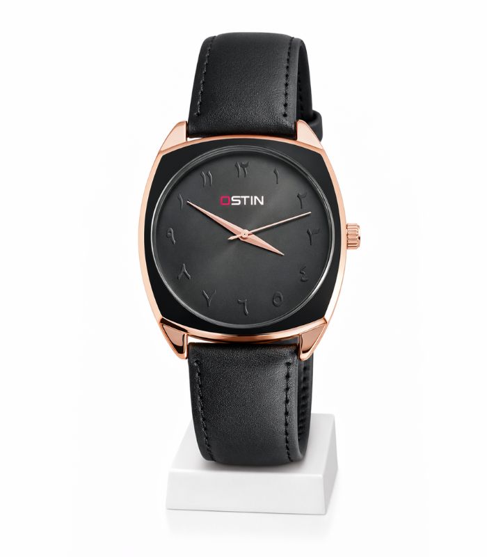 Stylish OSTIN men’s analog watch featuring a sleek black dial, rose-gold tone case, and premium black leather strap. Powered by precise quartz movement, this watch is perfect for office wear, casual outfits, and special occasions.